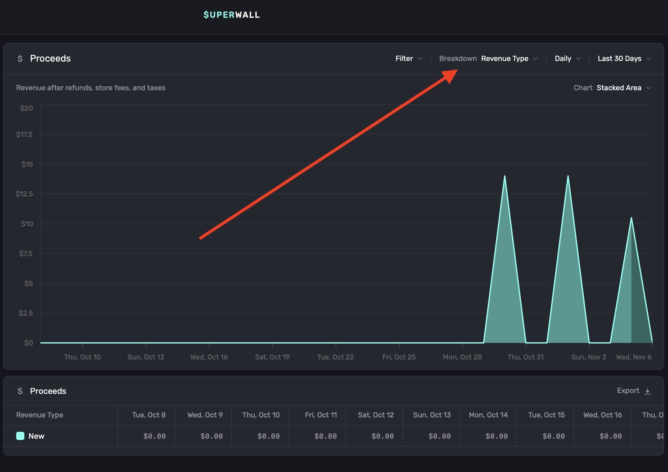 • Cohorted Proceeds: Net proceeds cohorted by Install Date, after refunds, taxes, and fees. Usually used in comparison to Ad Spend. Only includes revenue generated by Superwall.