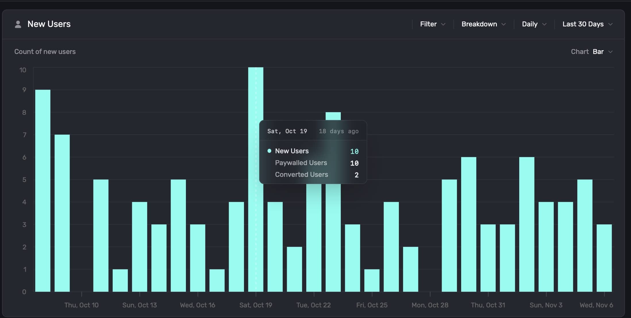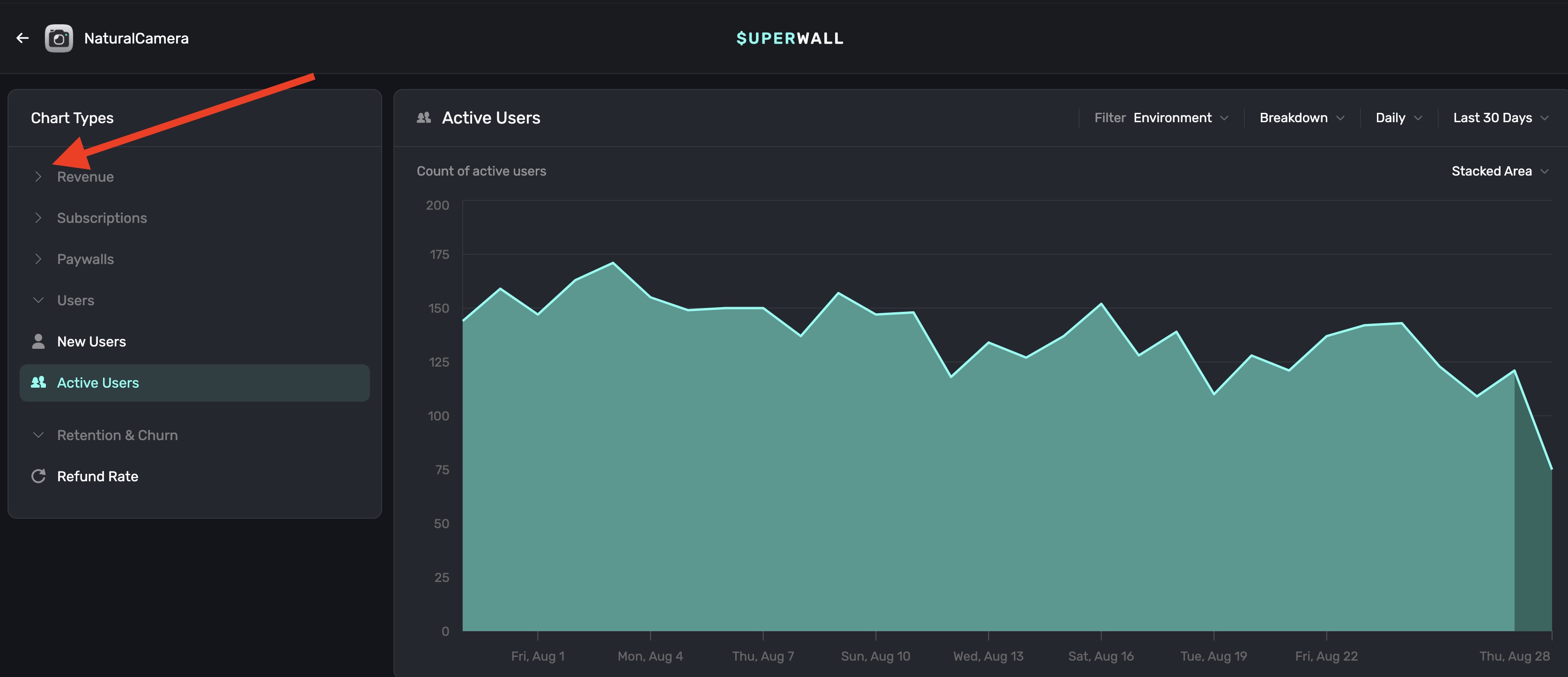 View charts detailing important metrics about your app's subscription performance, paywalls and more.