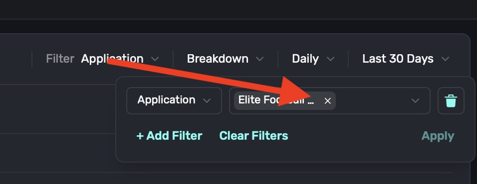 To remove an individual component that's part of a filter (i.e. breaking down by "Application" and removing one of the included apps), click on the X button on its trailing side: