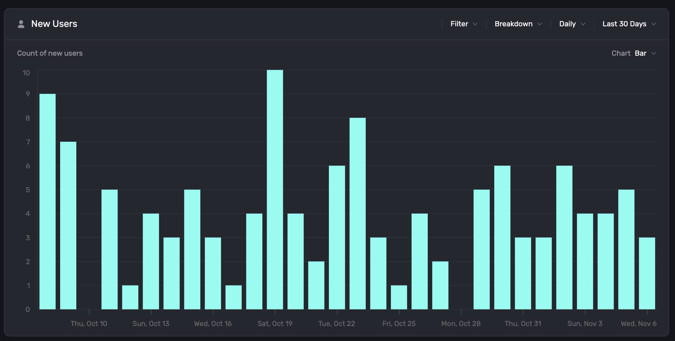 The breakdowns available are tailored to the type of chart you have selected. After you apply a selection, the chart will automatically update. At the bottom of the chart, the data displayed will also be updated according to your breakdown selection: