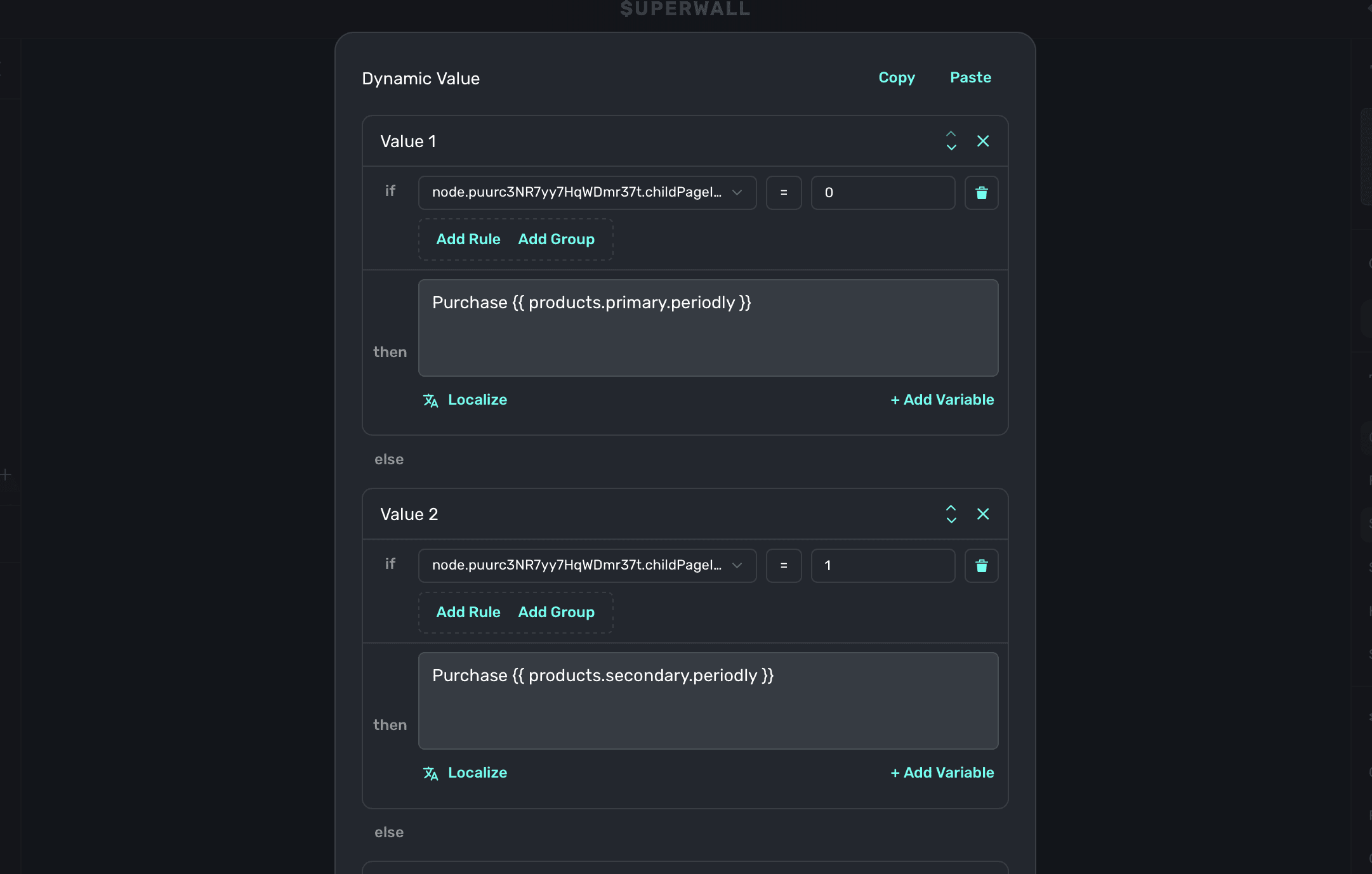 As another example, we could change the text to represent the different product periods we've set up for our fictional products of weekly, monthly and annual. By using a dynamic value, we can simply check which carousel index is showing and change the text accordingly: