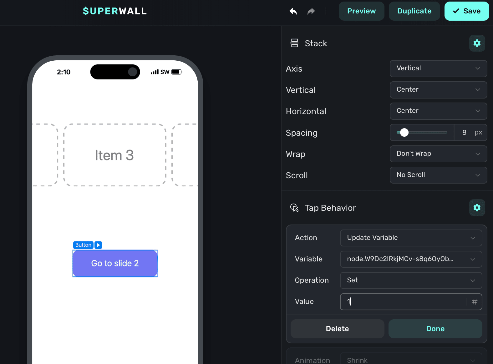 When a carousel element is added, Superwall automatically creates an element variable for it (accessed through the Variables tab in the left sidebar, or the variables button in the floating toolbar). Its name will match whatever is in the element hierarchy in the left sidebar: