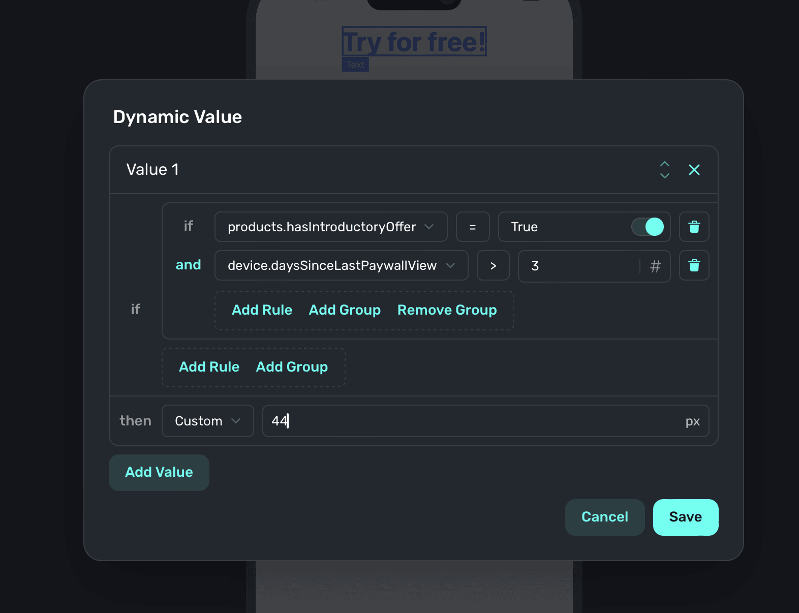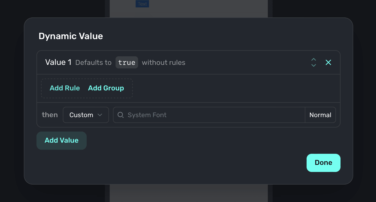 The dynamic values editor works like most control flow interfaces. You set a condition, and choose what should happen when it's met. You can chain multiple conditions together, too. Or, simply use an if/else format.