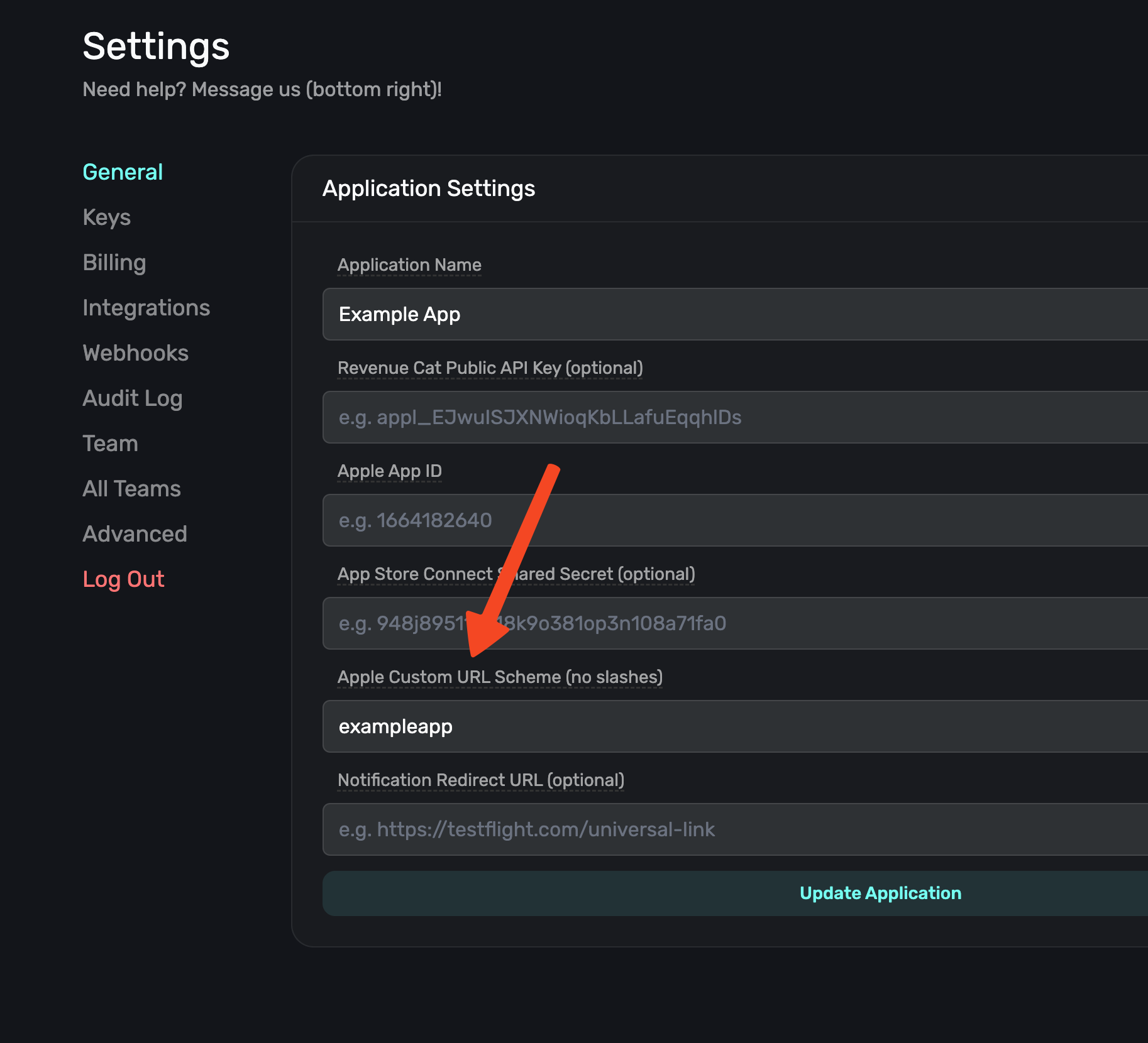 With the General tab selected, type your custom URL scheme, without slashes, into the Apple Custom URL Scheme field: