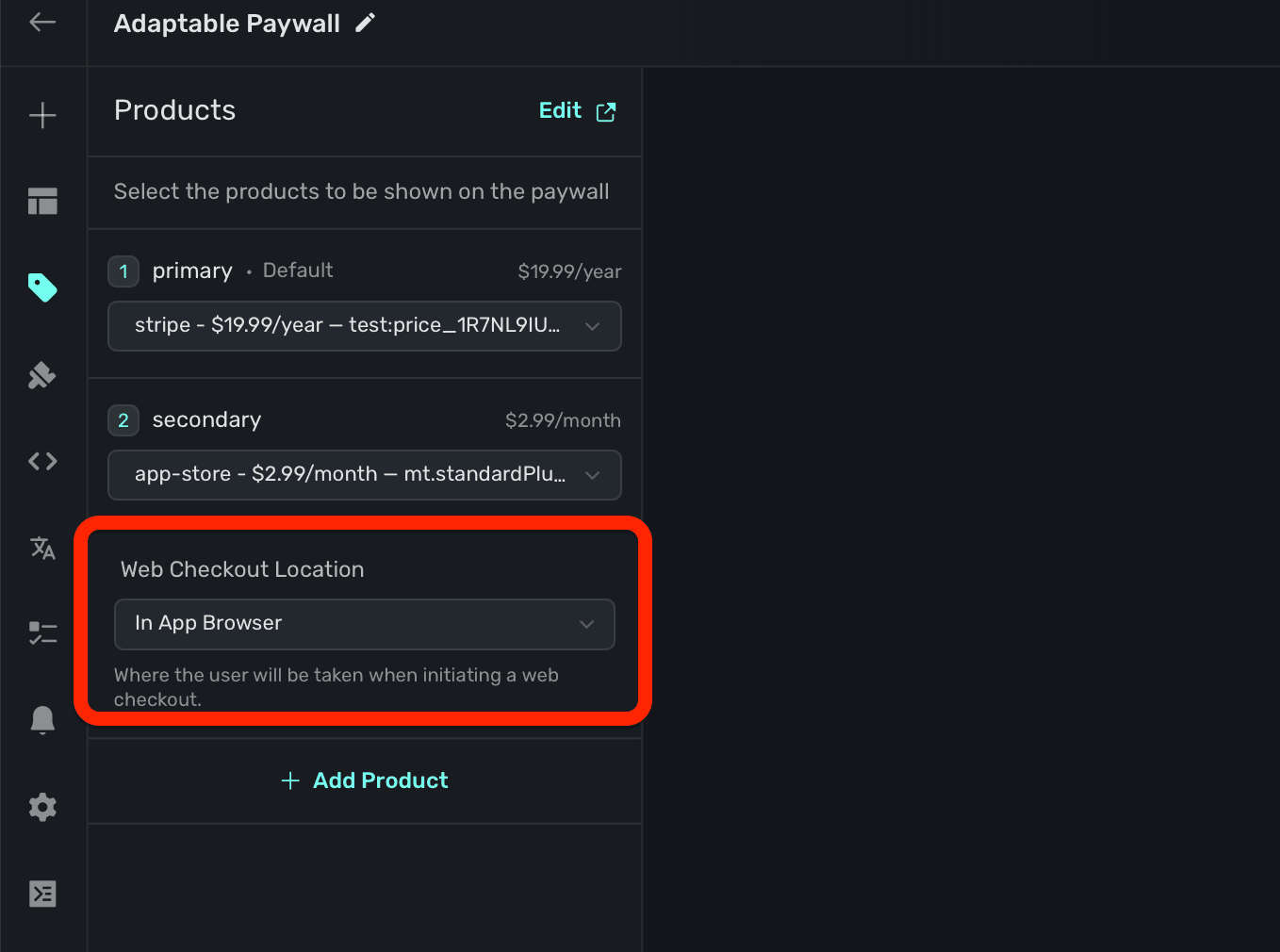 When using web checkout products (Stripe or Paddle products), you can control how the checkout experience is presented to users. This setting determines where the web checkout interface appears: