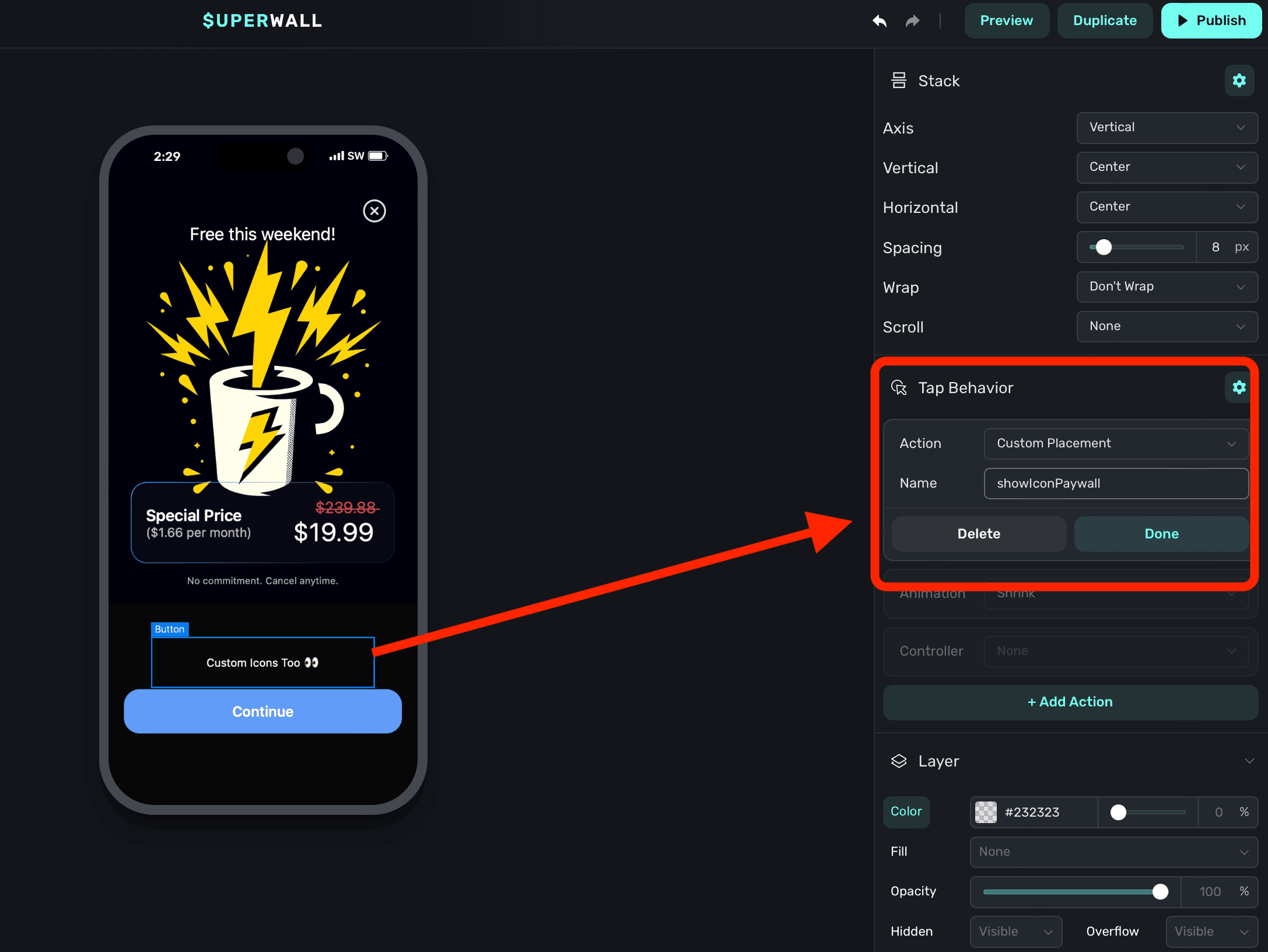 Select a component on your paywall and add a Custom Placement Tap Behavior, and name it whatever you wish (i.e. showIconPaywall).
