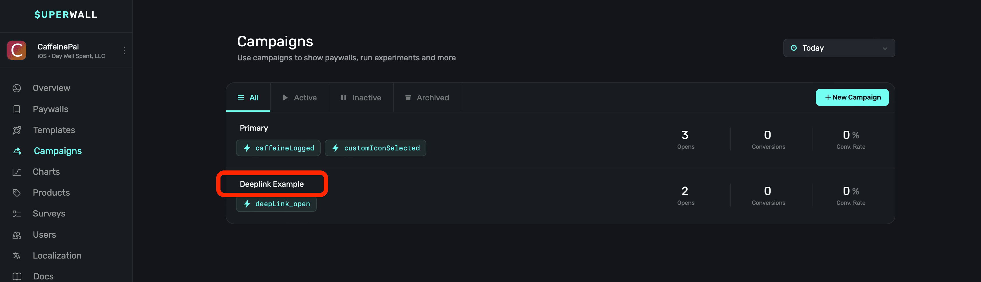 Create a new campaign specifically for this purpose, here β it's called "Deeplink Example":