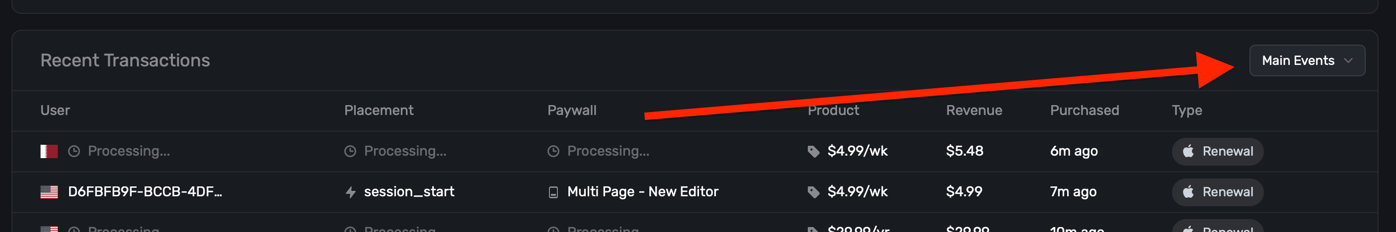 If you see the paywall or placement values blank — don't worry. This means the user started a subscription, reactivated or whatever the event may be out outside of your app. Typically, this occurs when they visit their Apple ID's settings and change subscription or products there manually. Further, processing simply represents just that — Superwall received an event, but some of the details are still being fetched. Typically, this shouldn't make more than a few minutes.