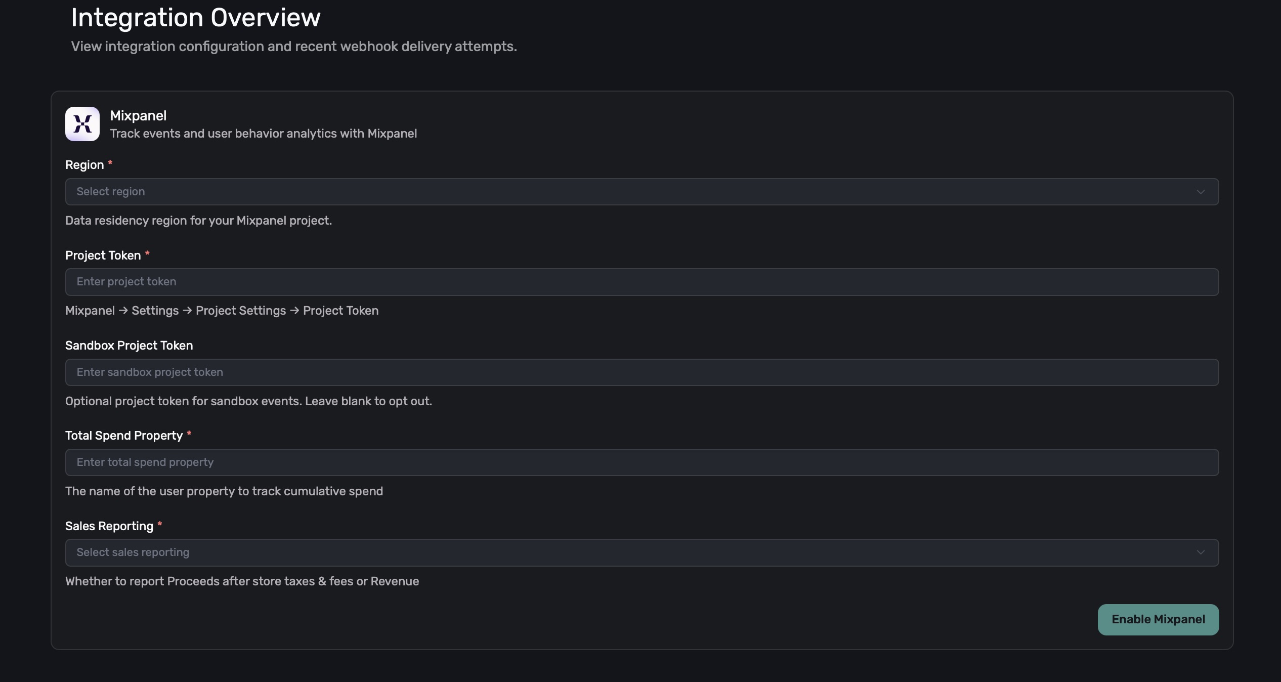 Fill out the following fields and click the Enable Mixpanel button at the bottom right to save your changes:
