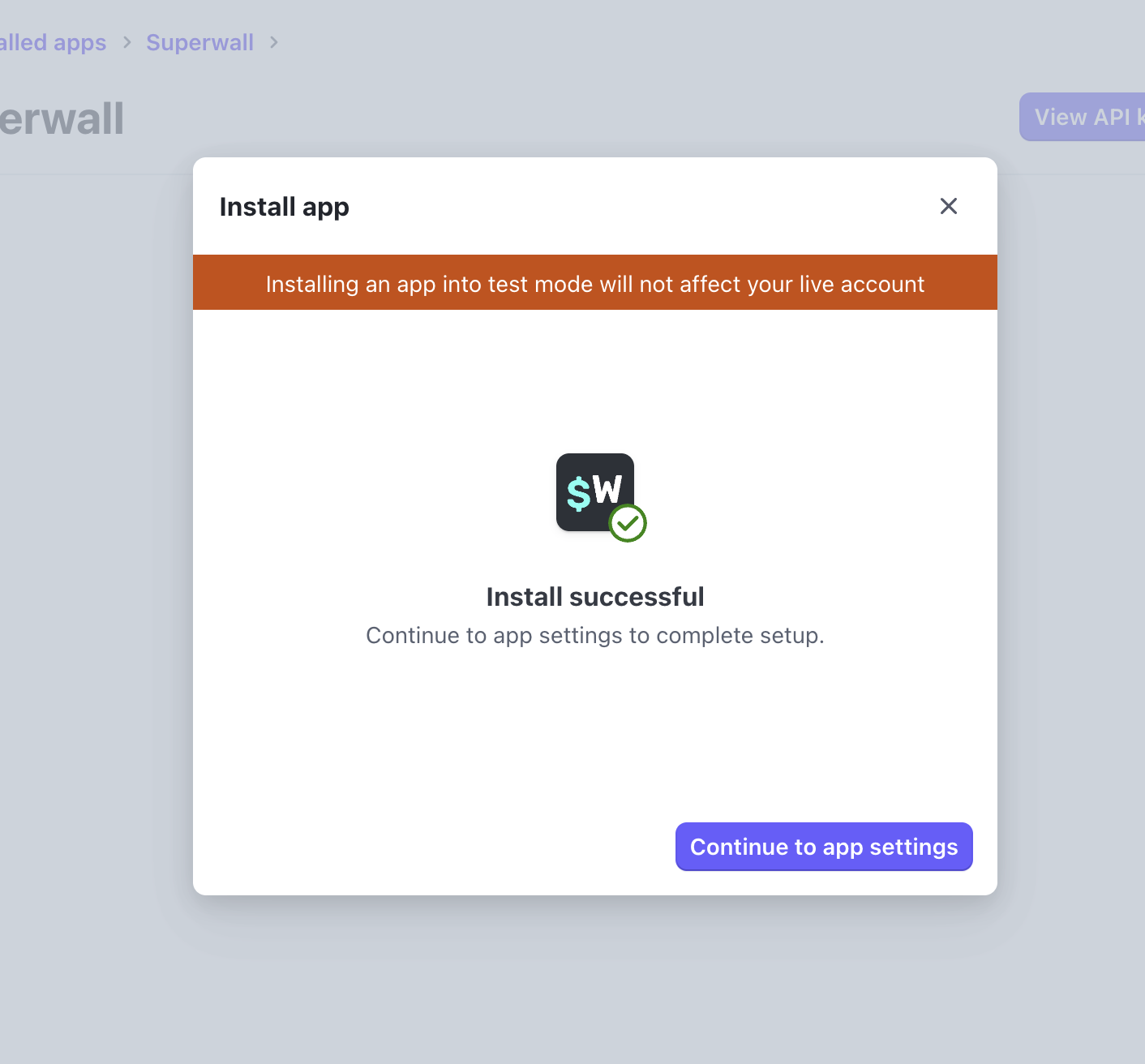 Navigate to the Superwall app in your Stripe dashboard. If already installed, find it under Apps: