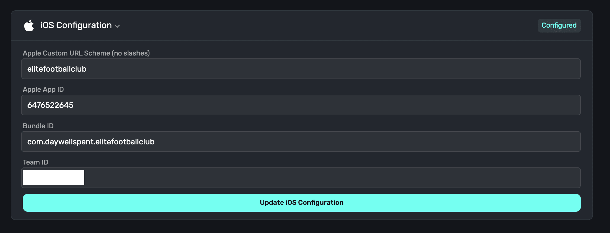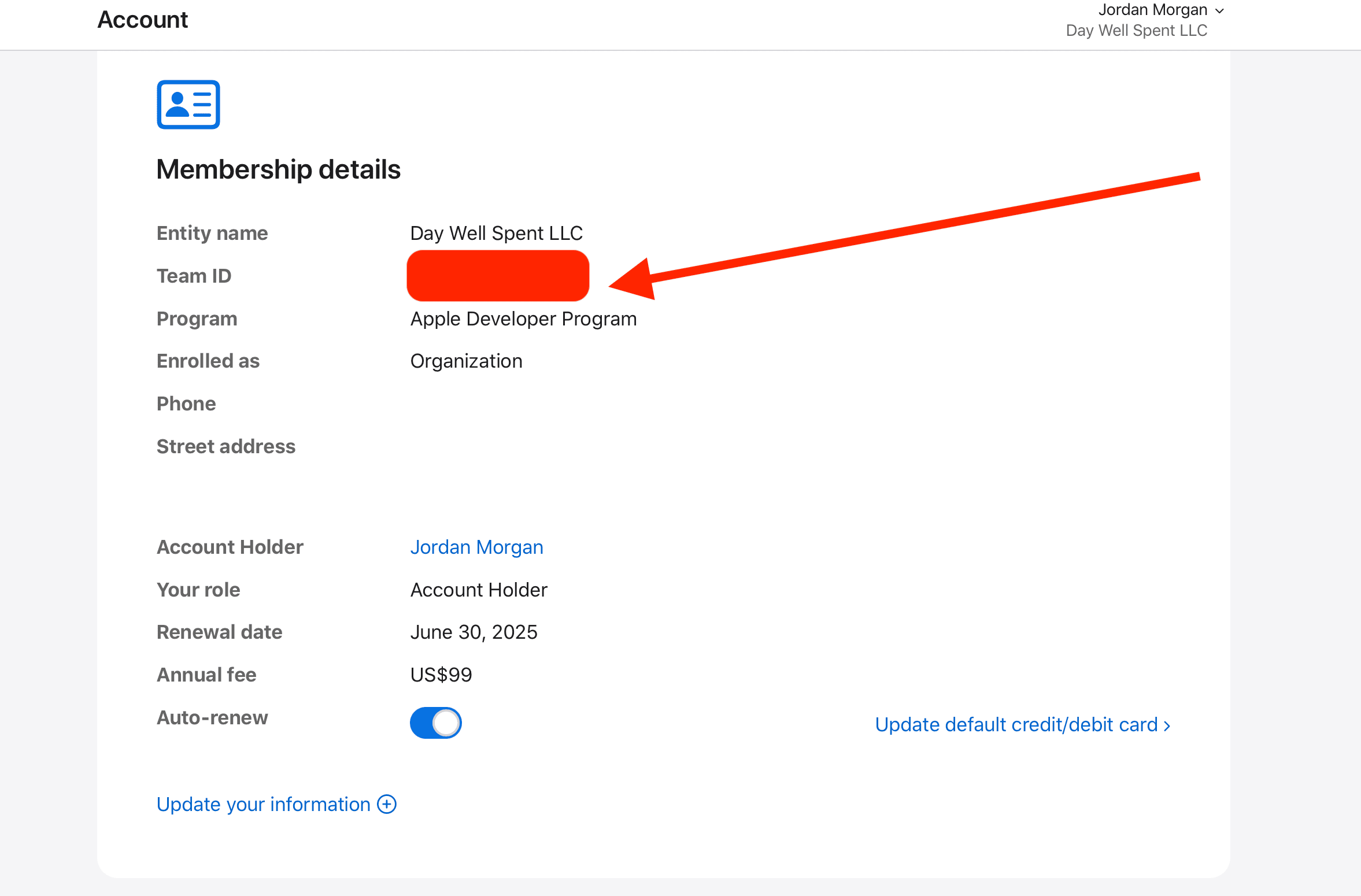 2. Team ID: The team ID that your iOS app belongs to. To find this, visit Apple Developer -> Account -> Membership details -> Team ID. It's obscured here, but it'll be where the arrow points in the image below: