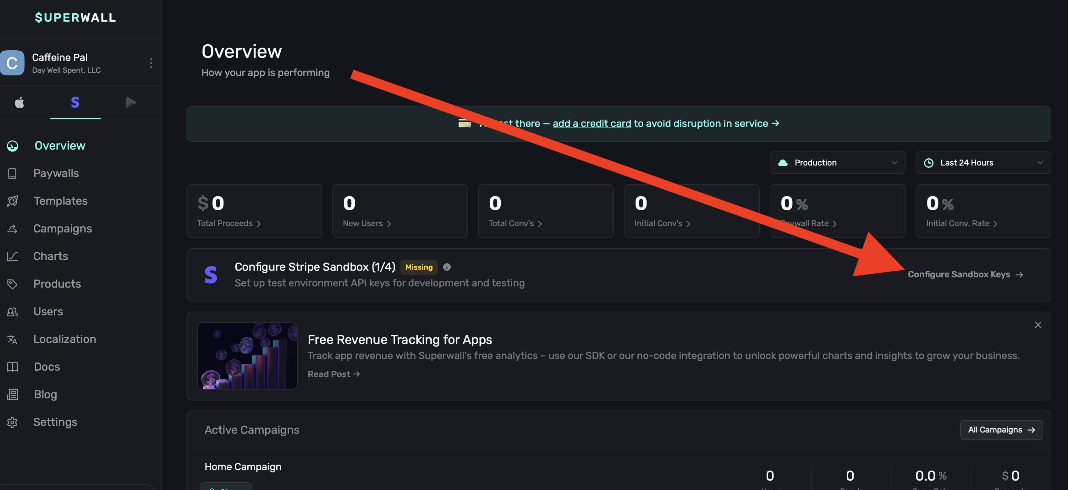Once you've created a Stripe app, you'll need to connect it with Stripe and fill in a few settings. This is a one-time setup that connects Superwall to Stripe. The easiest way to get started is to click on the link in your overview page, which will take you to your app's Settings page: